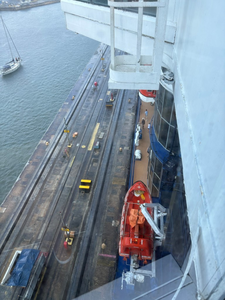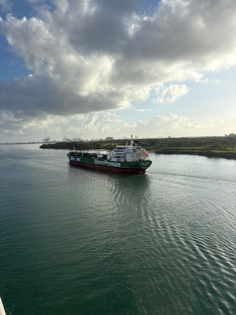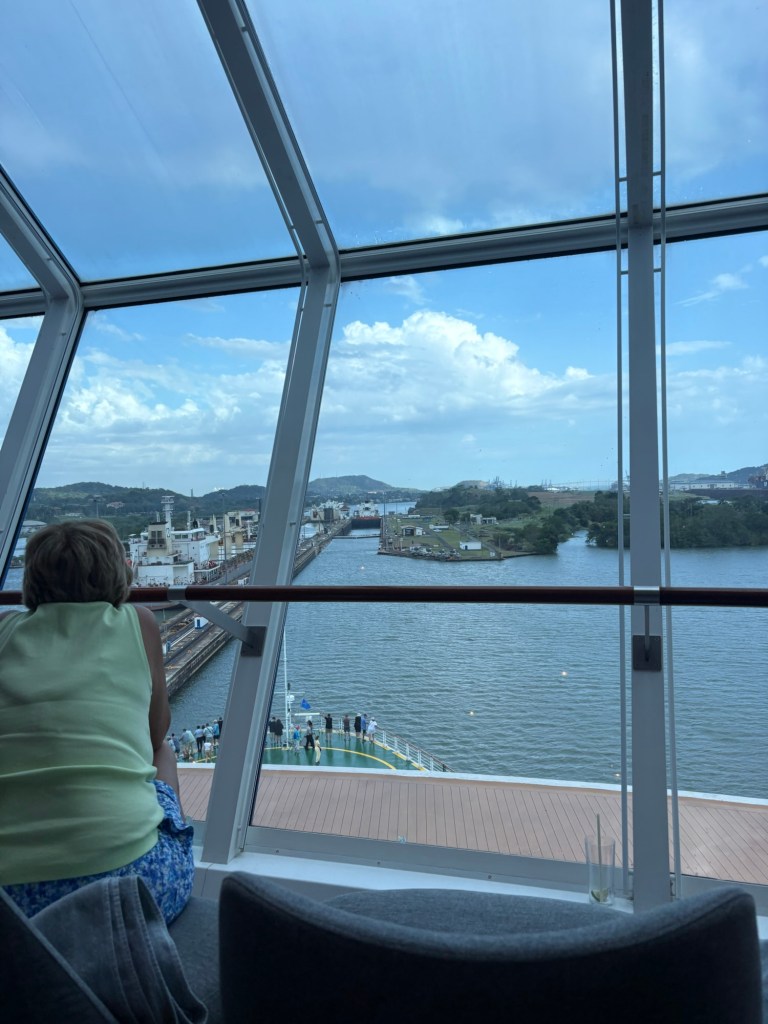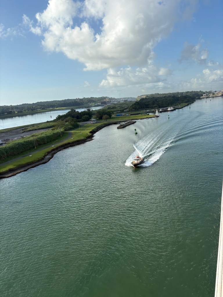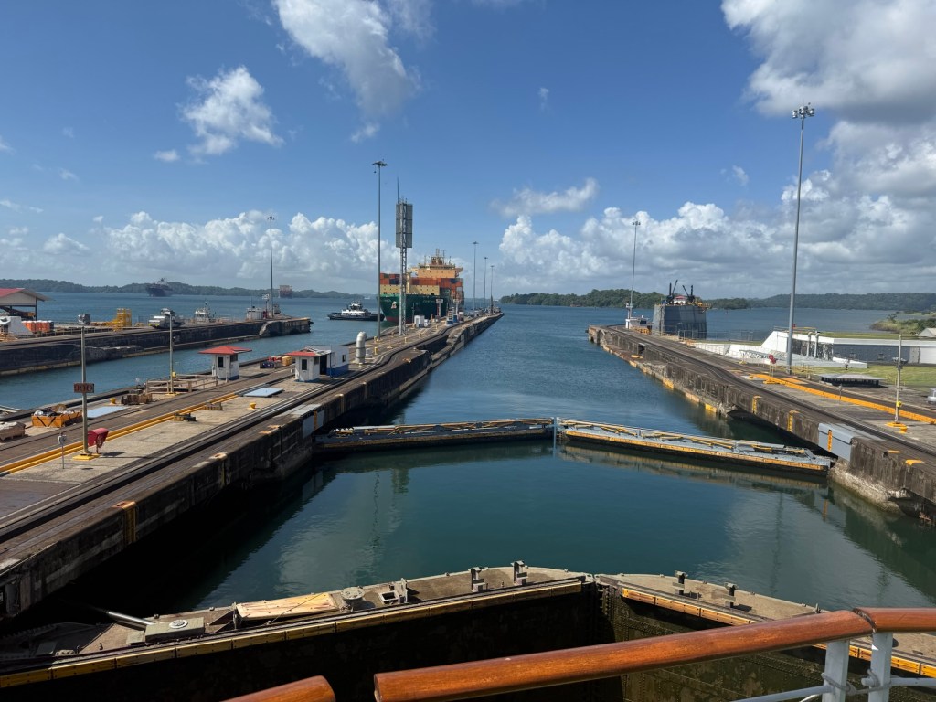 MAJOR bucket list ✅ today due to our Panama Canal crossing!! We went from the Atlantic to the Pacific, crossing completely through the center of Panama via their incredible lock system- wow! If you haven’t seen a lock system before (and definitely some of our fellow passengers had not!), you sail into each lock at your same water level, and it seals your ship in the chamber and then the water rises or lowers to release you into the next chamber (or body of water) at that level.