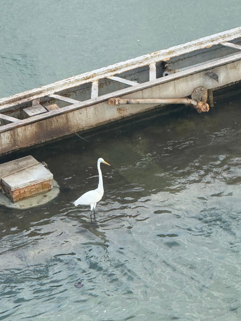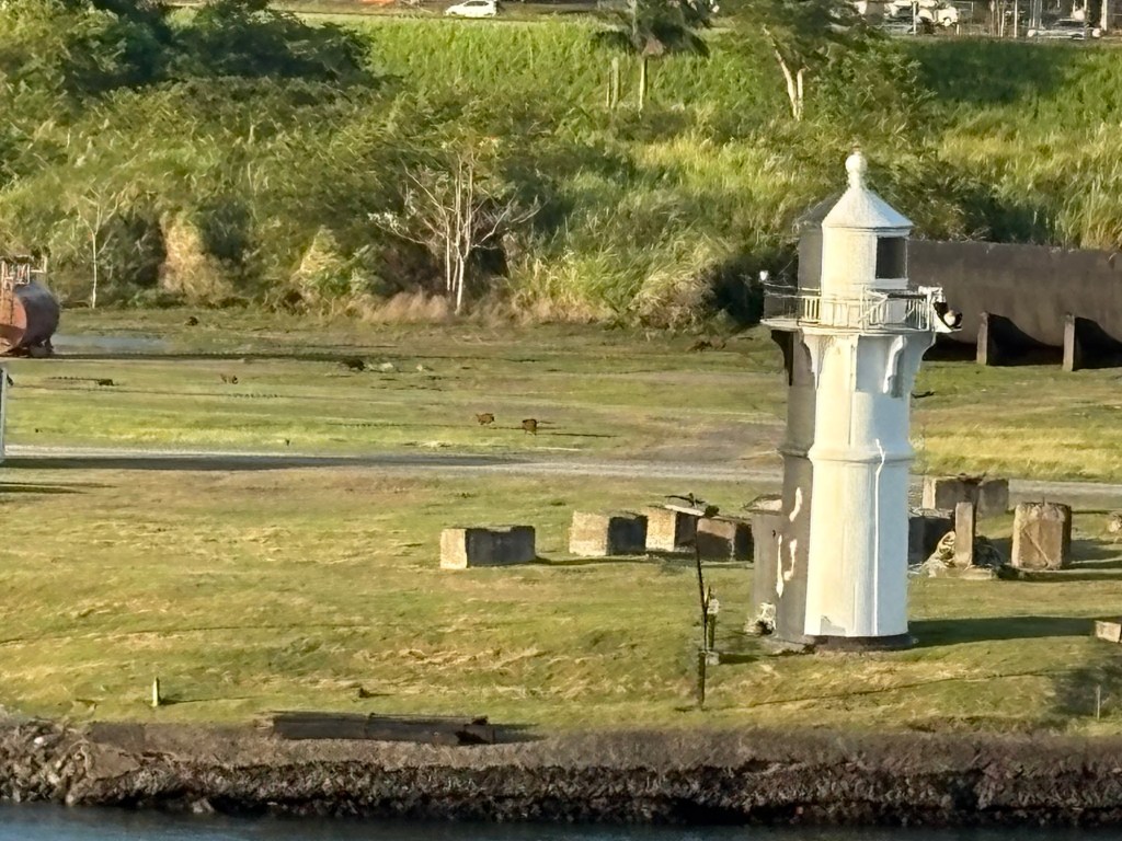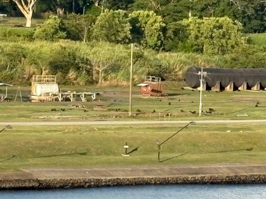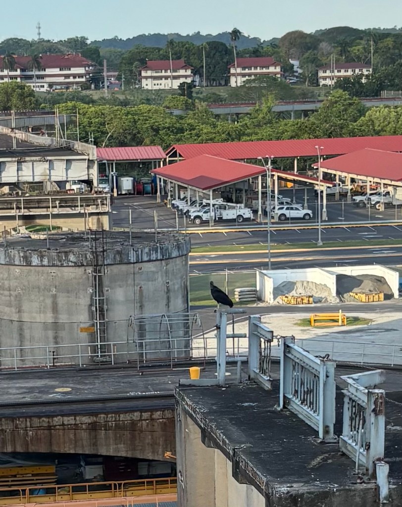 There are two locks in this part of the canal that lowered us from Miraflores Lake to the final section of our crossing in the canal. It was fascinating to see that each lock area we entered had viewing stands for the public to sit and watch ships go by with guides announcing what was happening in the lock process, and some had food stands and other entertainment, including an IMAX movie theater! On this leg there was a field full of deer grazing right near the canal. We were also amused by a heron who was fishing on the lock wall right by our ship. Imagine his surprise when the water level (aka his dinner plate) decreased by 32 feet!