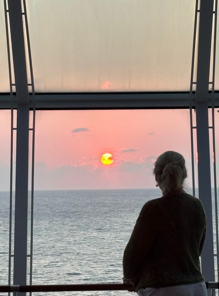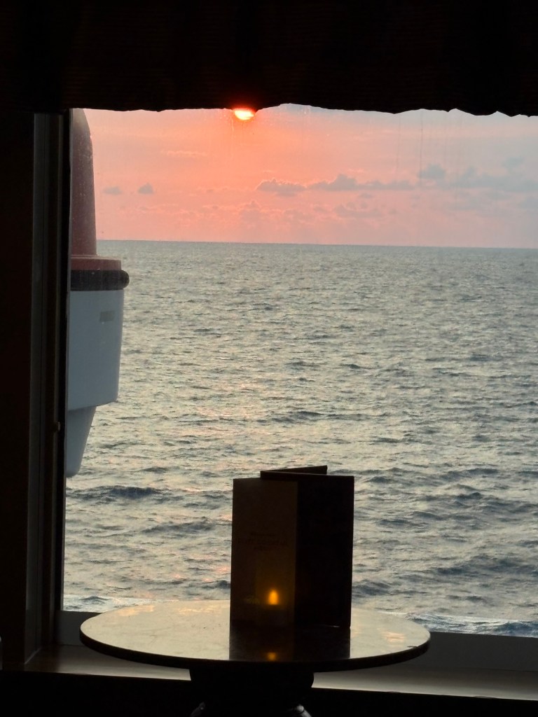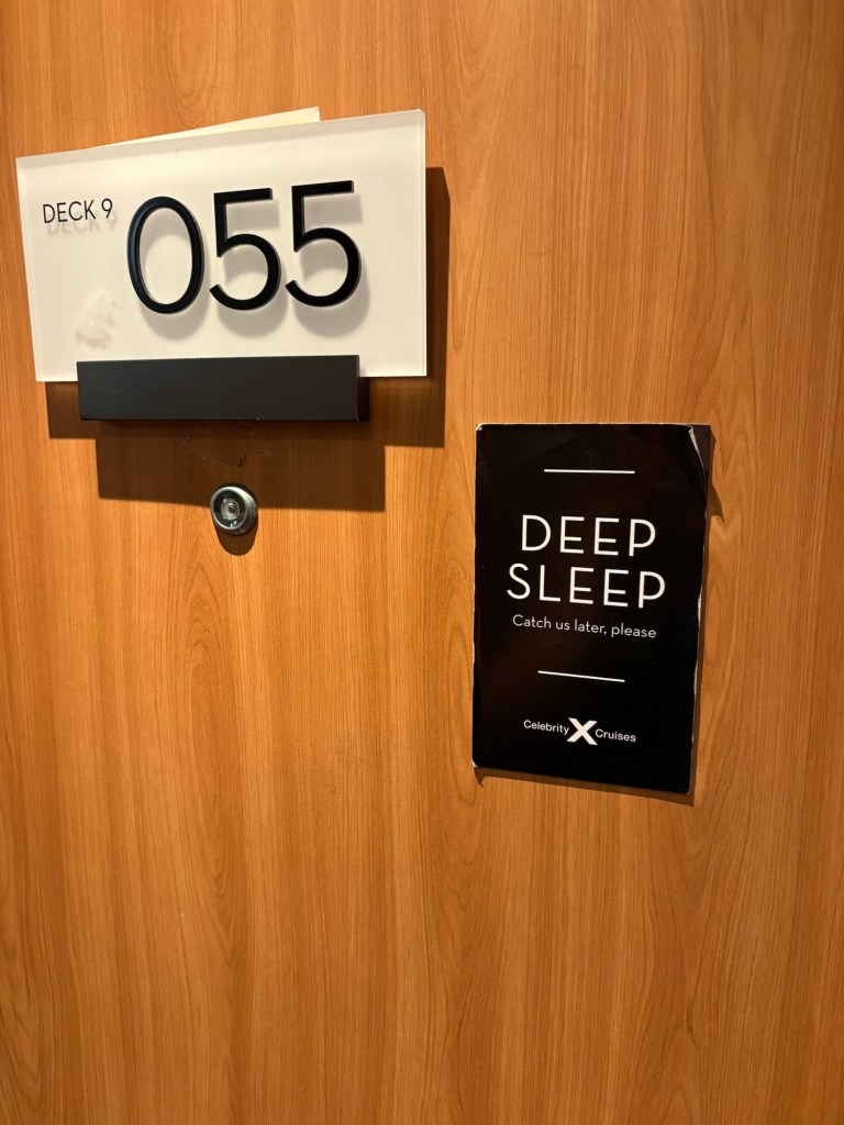 Funny/sad sleep-related story: one of the great benefits of cruising is, of course, having our cabin steward come in twice daily to clean and refresh towels and do nightly turn down service. Like a hotel, the ship gives you a sign to put on your door indicating if you are sleeping or want your room cleaned up, and they never disturb you if the sign is on the door. Most days on the ship we have been getting up around 8-9:30 range to either get off the ship or go to a port talk or some other morning activities. These last few days with not exiting the ship we have been sleeping later. I don’t know exactly what hours the cabin stewards usually work, but I do know they start very early! Yesterday we had a realllly good sleep in and didn’t wake up until about 11:30 a.m.. I heard a noise outside our cabin door when I awoke, so I went to the door and looked out our little cabin peephole. There, slumped against the wall, was our cabin steward. He was just hunched down and staring off into space, like maybe he had been there for hours, right outside our cabin door. I don’t know how long this man had actually been waiting for me to wake up, but it was the saddest and most guilt-inducing sight I had seen on this ship. I speed dressed with the guilt of a thousand lazy people, and left the cabin to hear his cheery “Good morning, err, good afternoon ma’am!” Note to self: leave big tip for cabin steward.